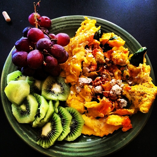 Meal 1: 2 whole farm fresh eggs scrambled with 1tbsp salsa and sprinkled with feta, 1-2 cups of fruit, 1/4 avocado, cup of Yogi Blueberry tea, 16oz h20. Supplements-biotin (for hair and nails), vitamin C (for combating pesky colds), green coffee extract (to aid in weight loss) and b12 (for energy!)
