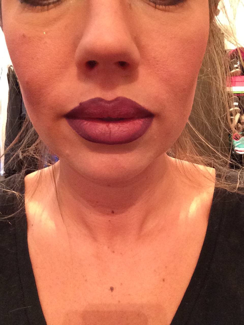 Next, go in with your base color. This will determine what color your lipstick will turn. You can choose a red (brick from MAC is an all time favorite,) or you can be like me and go much, much darker. Because I want my lips to be a bloody, black red, I use “Night Moth” from Mac, which is a deep, dark gothic purple. I apply it pretty heavily around the outside corners, then smudge it in toward the middle for an almost ombré look.